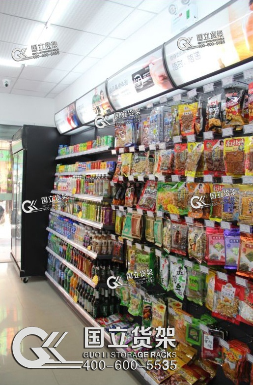 8.货架:货架的组合有单面架(推荐深圳国立便利店外弧型灯箱挂板单面货架)、双面架(推荐国立中岛网背板双面架,采用优质质木加冷轧钢)、促销四面展架(推荐国立促销展架,采用冷轧钢加亚克力材质)等,原则上每4-4.5平方米可构建一组货架;