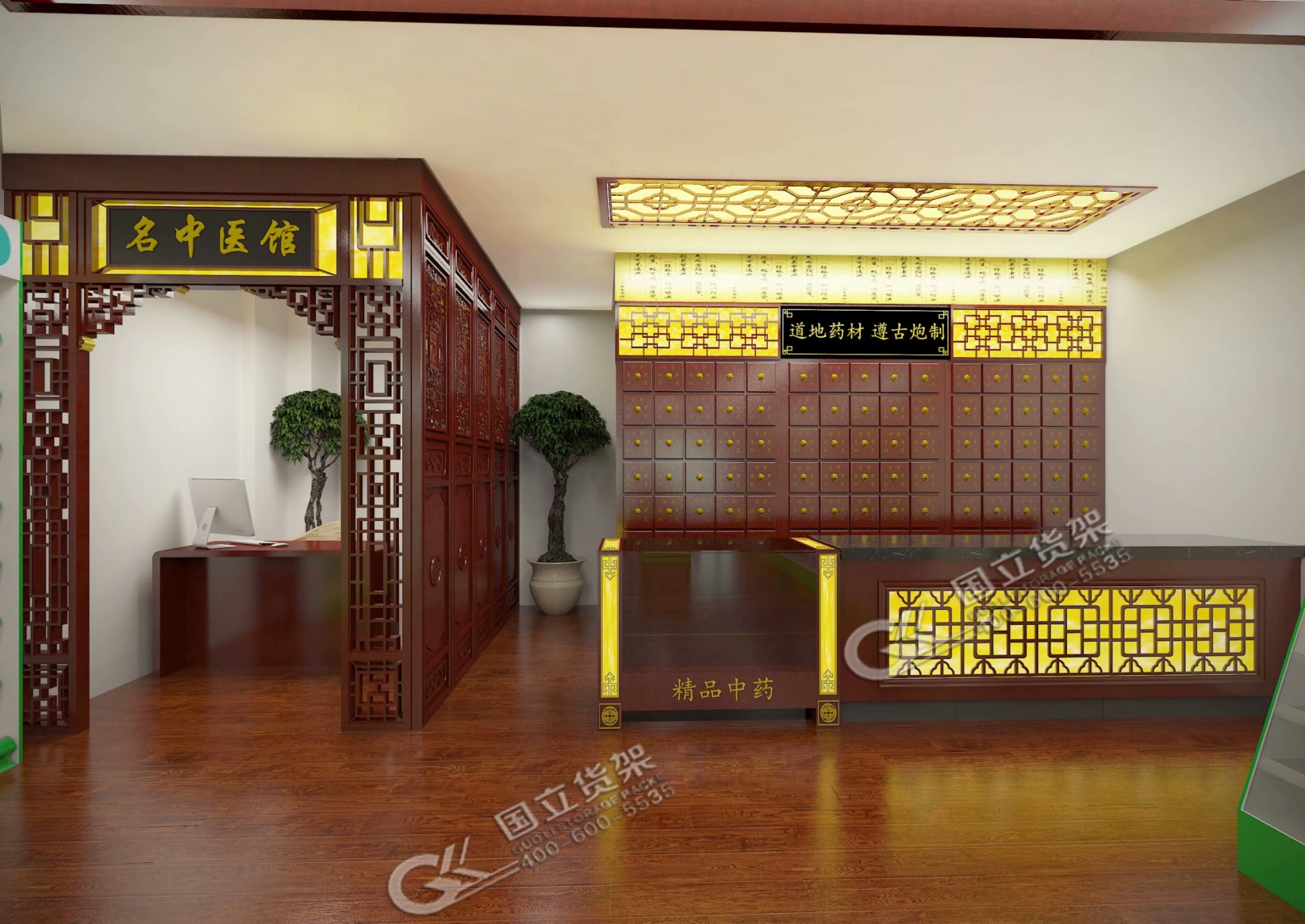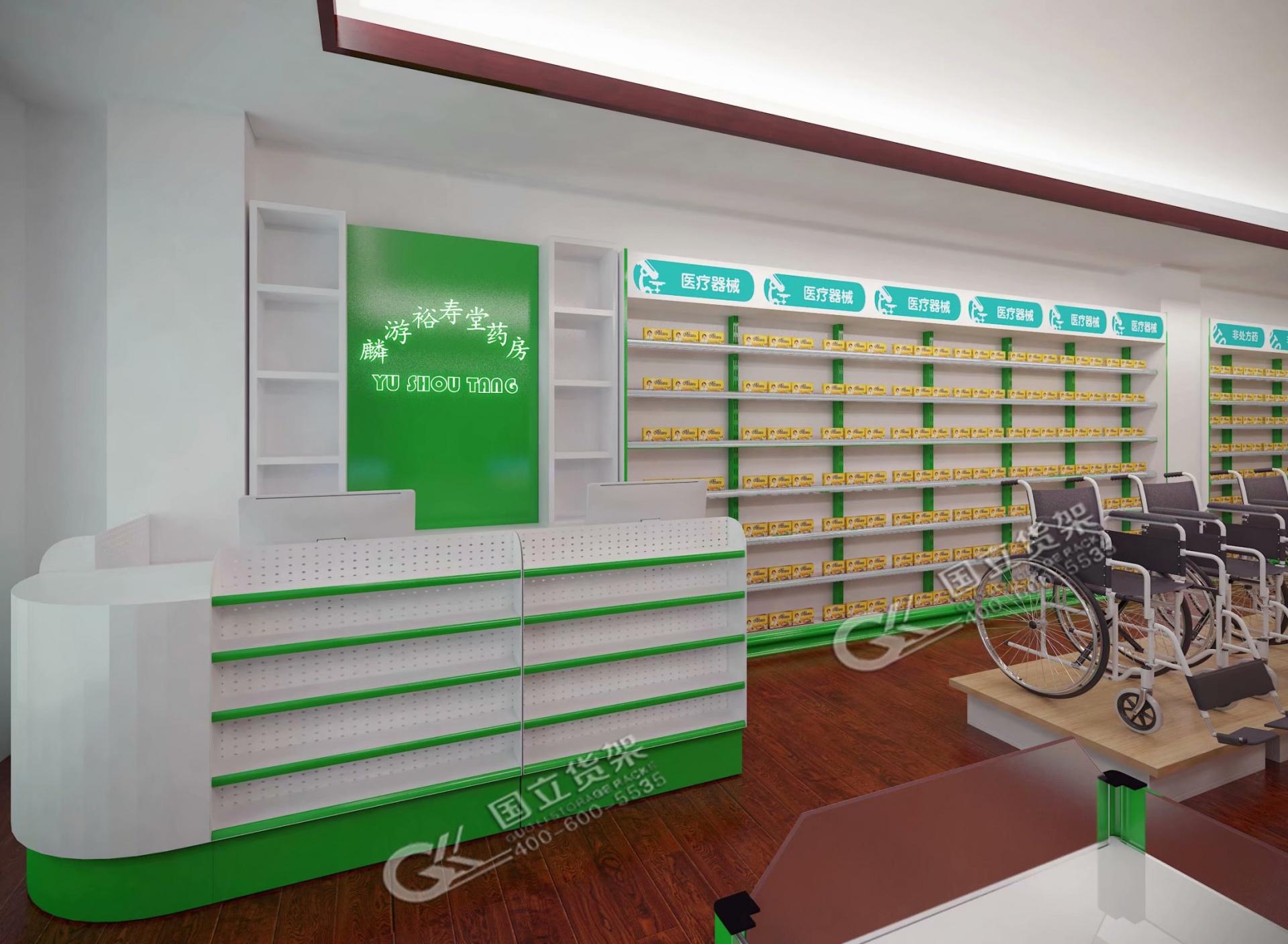 收银台作为所有顾客最终的“集结地”,在视觉策划时当然不能掉以轻心。收银台应布置在靠大门进口处,但考虑到药店小收银台又不 能太小,所以做视觉策划时第一位要考虑的是不能影响顾客的出入。